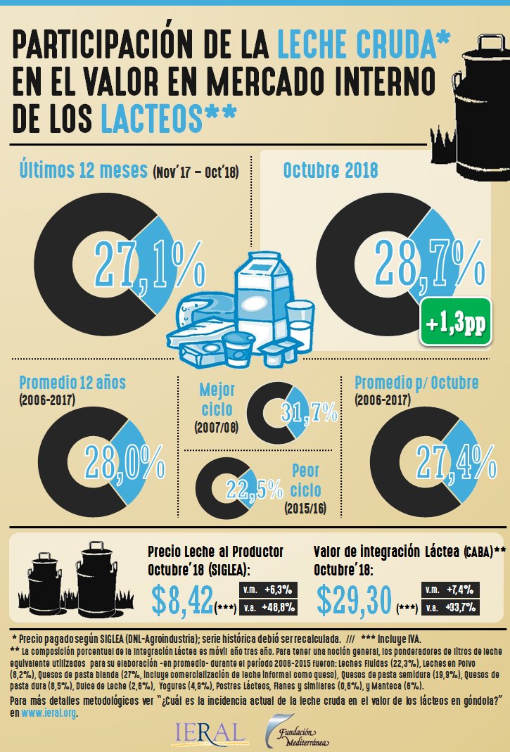 La participación de la leche cruda en el valor en mercado interno de los lácteos fue en octubre del 28.7% según analizó la Fundación Mediterránea. Eso muestra un incremento en la comparación anual del 1.6%.