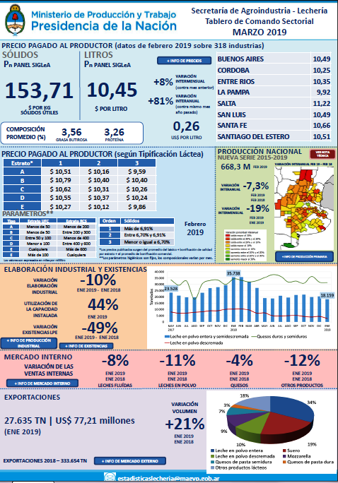 En cuanto a la industria y la producción láctea del país, la comparación entre febrero 2018 y febrero 2019 mostró una reducción del 7.3%.