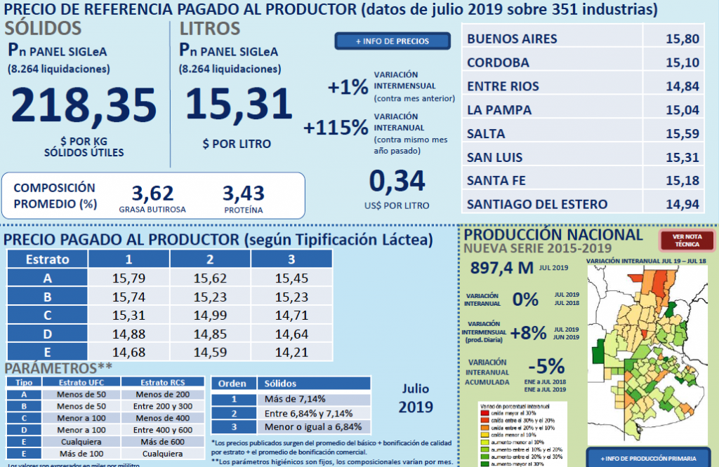 Con el análisis de 351 industrias lecheras la tabla del país puso como valor promedio 15.31 pesos el litro, con una variación intermensual del 1% casi imperceptible en relación a junio. Pensando en el 2018 el incremento es del 115%.