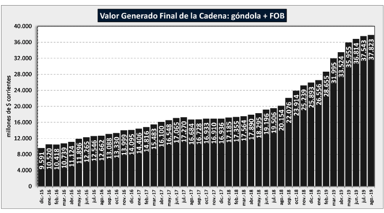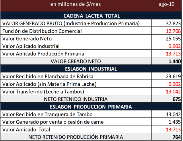 La facturación total de la cadena de valor lácteo, fue en el mes de agosto de $ 37.823 millones lo que representa un incremento del 0,74% respecto al mes anterior y del 87,7% interanual.